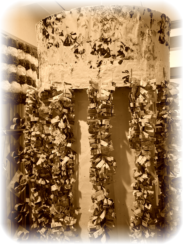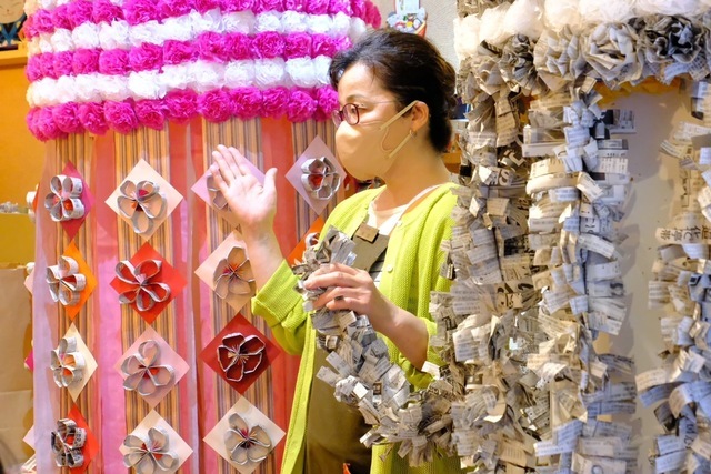 新聞で作った飾りのアップ。つくったのはいいものの、地味に見えてしまうかとかなり不安でした。飾りを見上げる皆さまの笑顔で苦労が報われました。本当にありがとうございました。