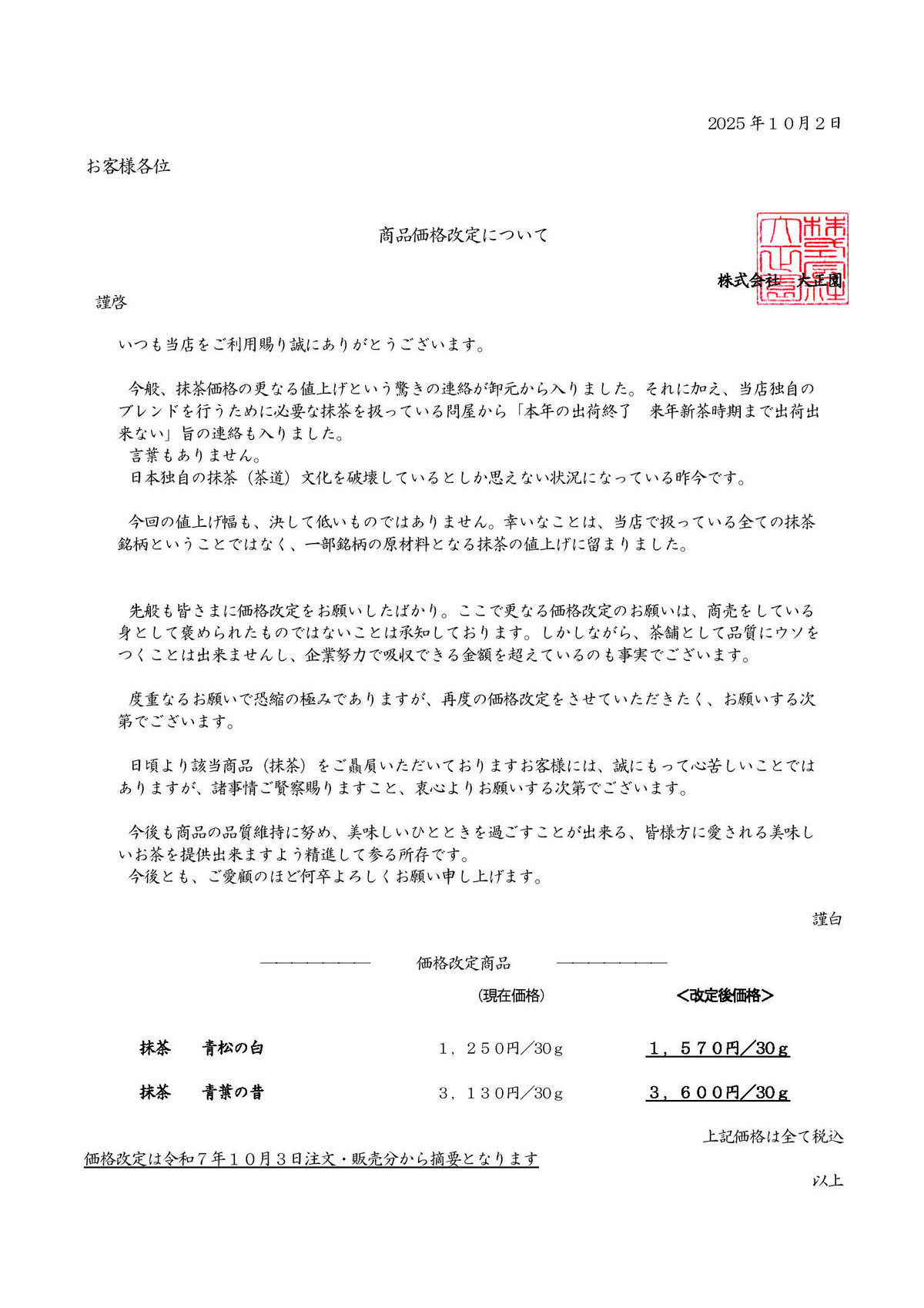 伊達政宗350年遠忌記念茶会で使われた抹茶で、こちらの銘柄もお茶会で好まれているお茶です。